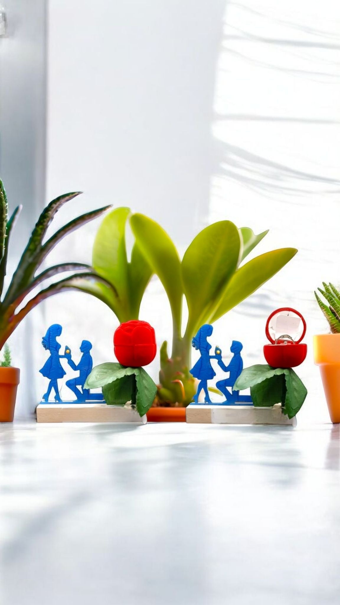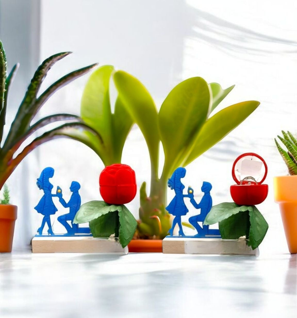 The ring itself is beautifully displayed in a plush red rose-shaped ring box, adding a touch of classic romance to the scene. The silhouettes are mounted on a natural wooden base, providing a stable and rustic touch.