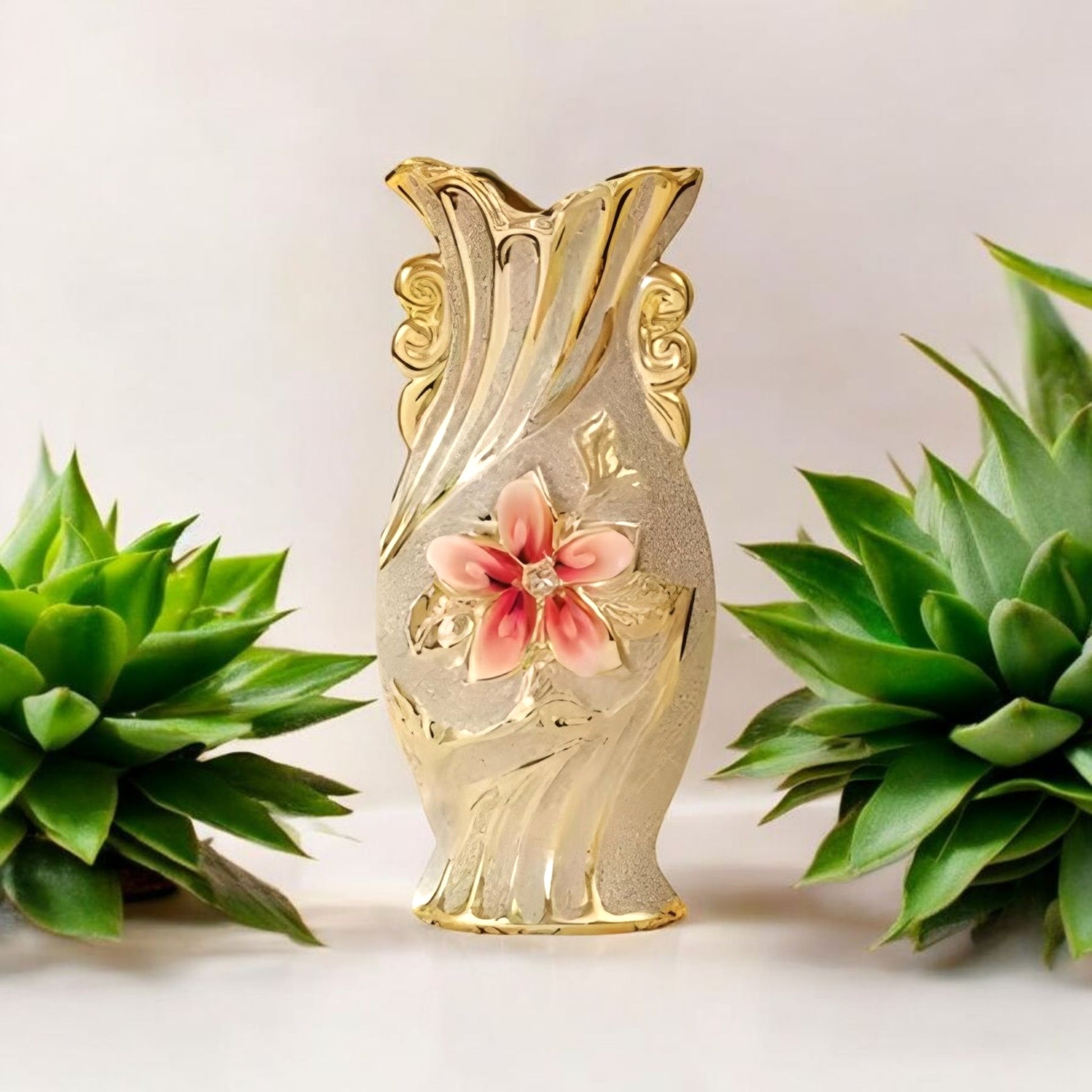 Elevate your home décor with this stunning Elegant Gold Flower Ceramic Vase—a luxurious centerpiece designed to add a touch of glamour to any space. Crafted from high-quality ceramic with a shimmering golden finish, this vase features an intricately sculpted 3D floral motif with a pink blossom and rhinestone center for added sparkle. Its rich texture and artistic design make it perfect for displaying artificial flowers, dried arrangements, or as a standalone statement piece. Ideal for living rooms, hallways, or office desks, it blends traditional charm with modern opulence. A beautiful and affordable gift choice for weddings, anniversaries, or housewarmings.