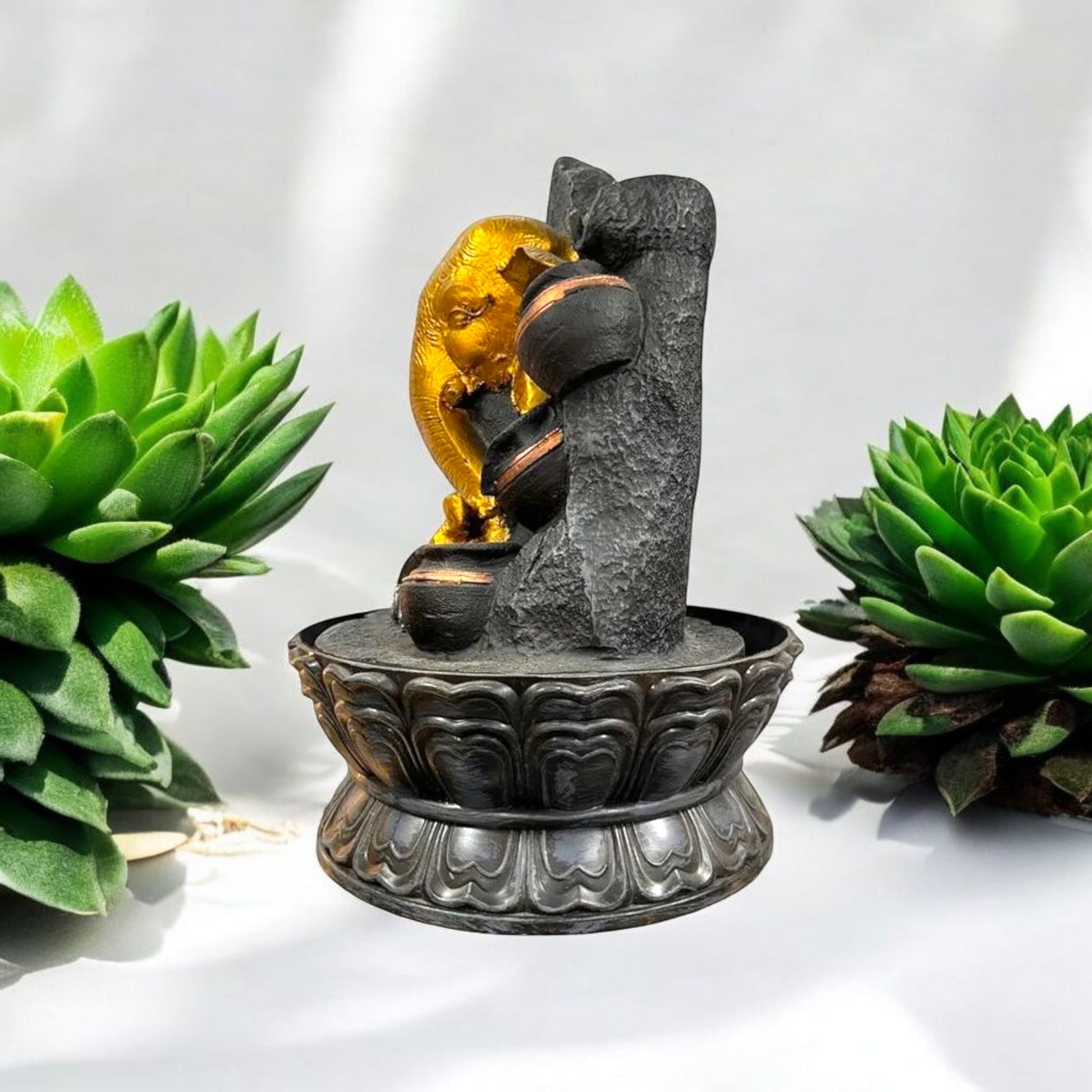 Enhance your space with divine tranquility using this stunning Ganesh Face Water Fountain. Featuring a beautifully sculpted golden Ganesha face with a blessing hand symbol, this fountain radiates calmness and positive energy. The water gently flows from the stacked pots, creating a soothing sound that brings peace to your home or office. The base, designed with a lotus pattern, adds an extra layer of elegance and charm. Made from durable polyresin, it's lightweight and easy to install.