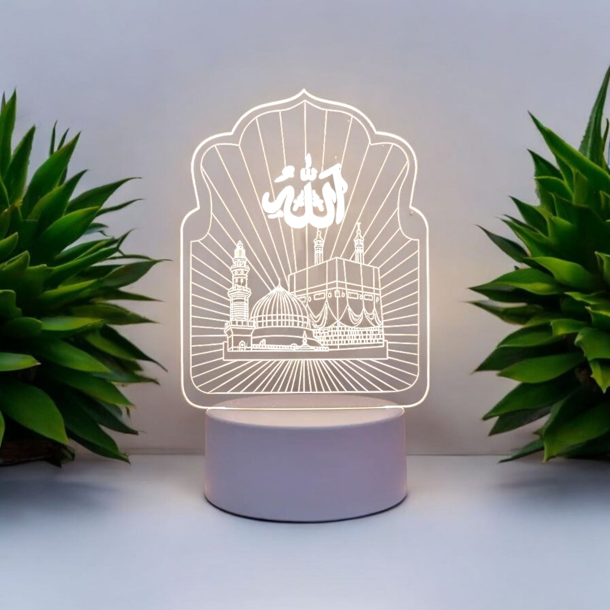 Enhance your space with the serene glow of this Islamic Kaaba LED Night Lamp, a beautiful blend of faith and modern aesthetics. Featuring a finely etched image of the Holy Kaaba and Masjid Nabawi on clear acrylic, it emits a calming white light from its base, creating a peaceful ambiance ideal for prayer time, home décor, or spiritual reflection. The elegant arch-shaped design is paired with energy-efficient LED lighting, making it a long-lasting and low-maintenance addition to any room. Whether placed in a living room, bedroom, or prayer corner, this lamp adds a divine touch to your décor. A thoughtful gift for Eid, Ramadan, or any special Islamic occasion.